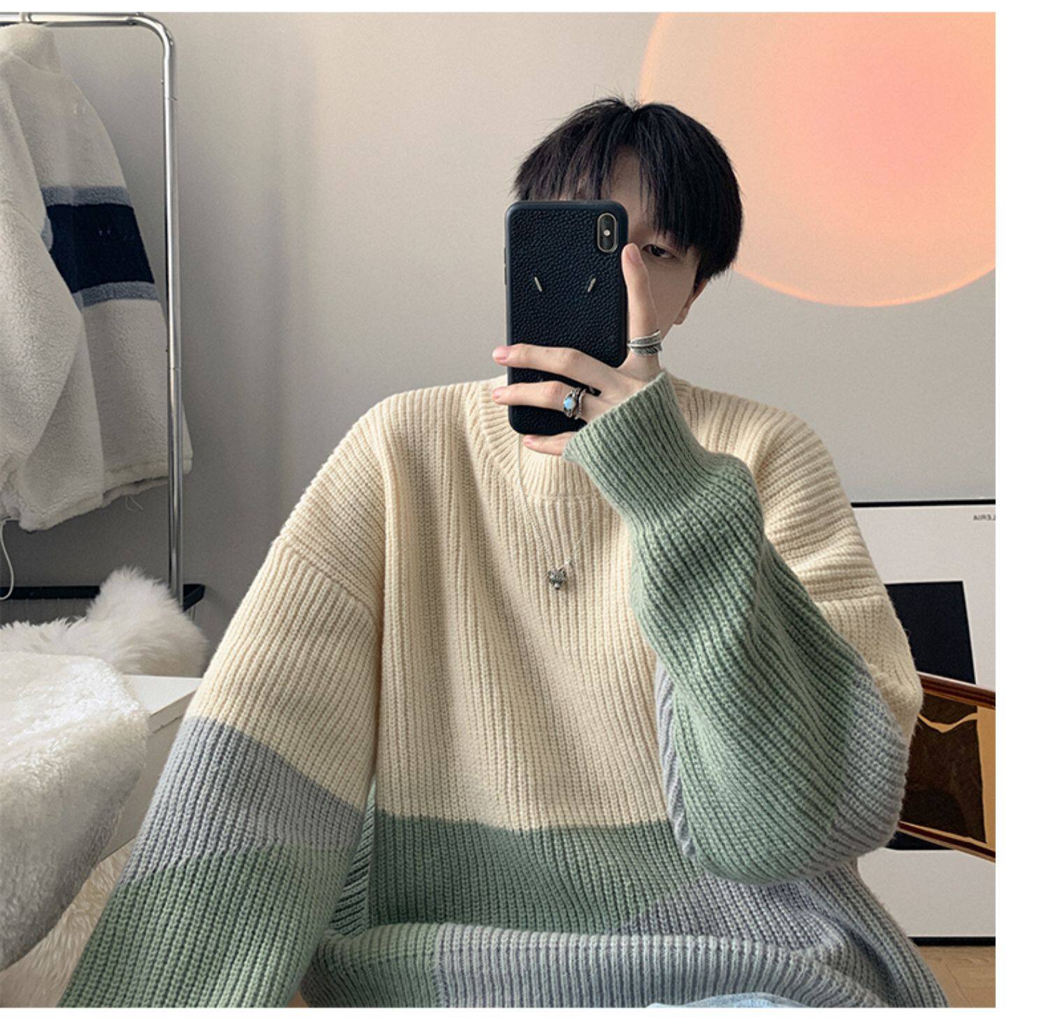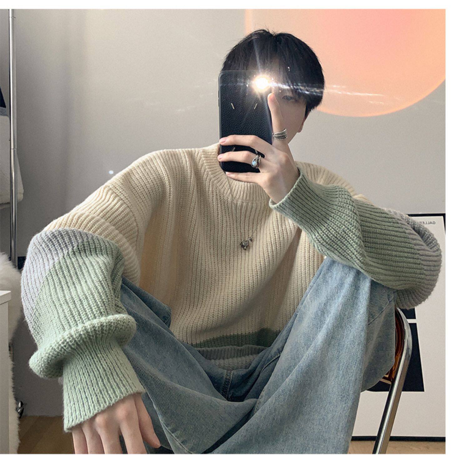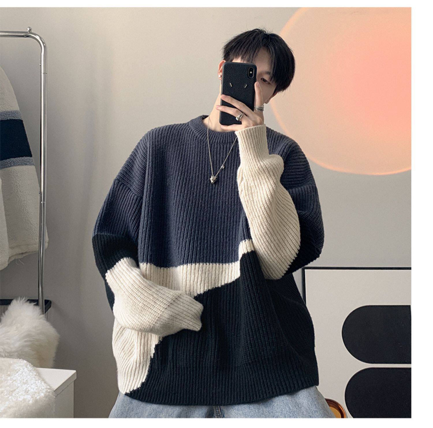 圆领毛衣男生秋冬季oversize时尚外穿休闲针织衫加厚拼接百搭毛衫