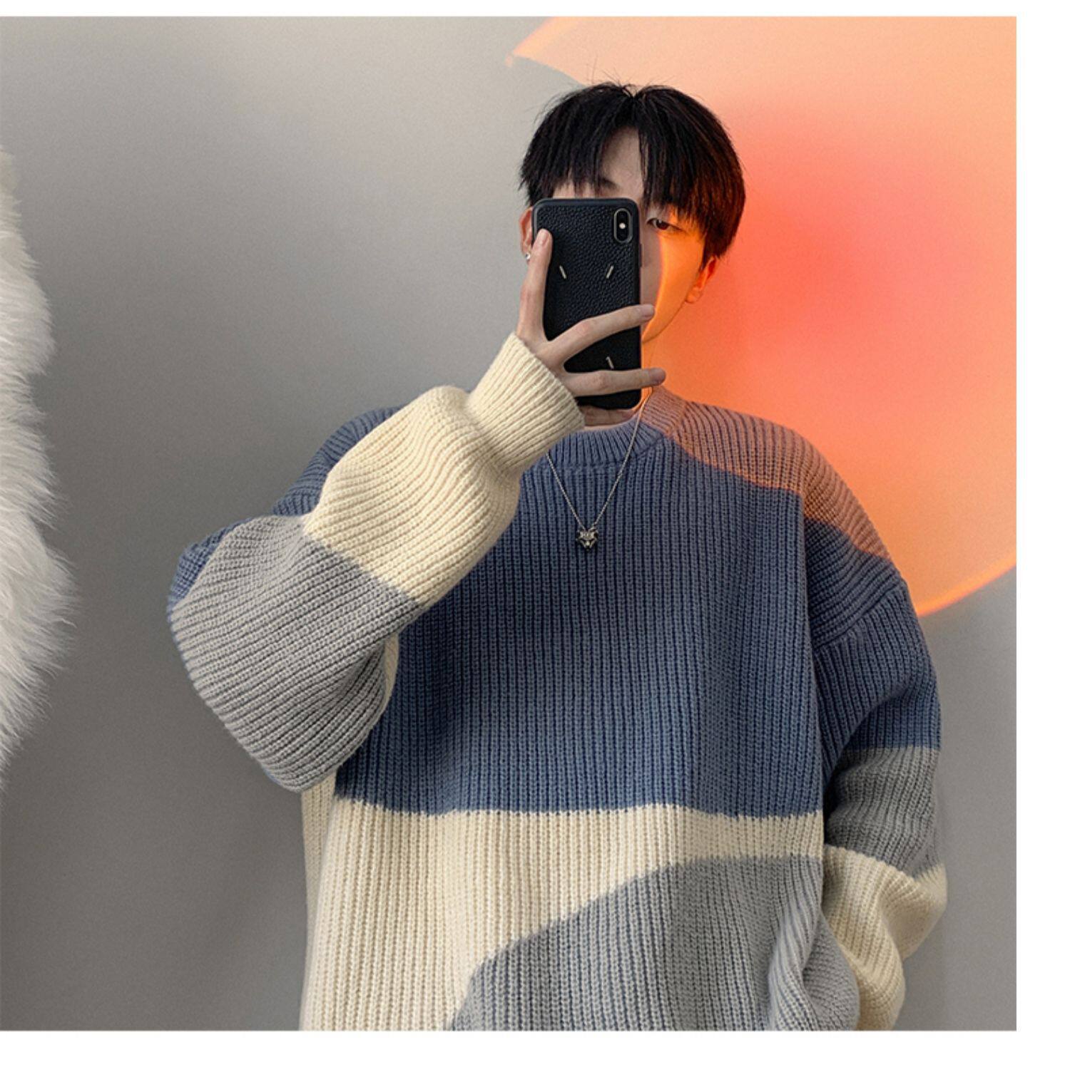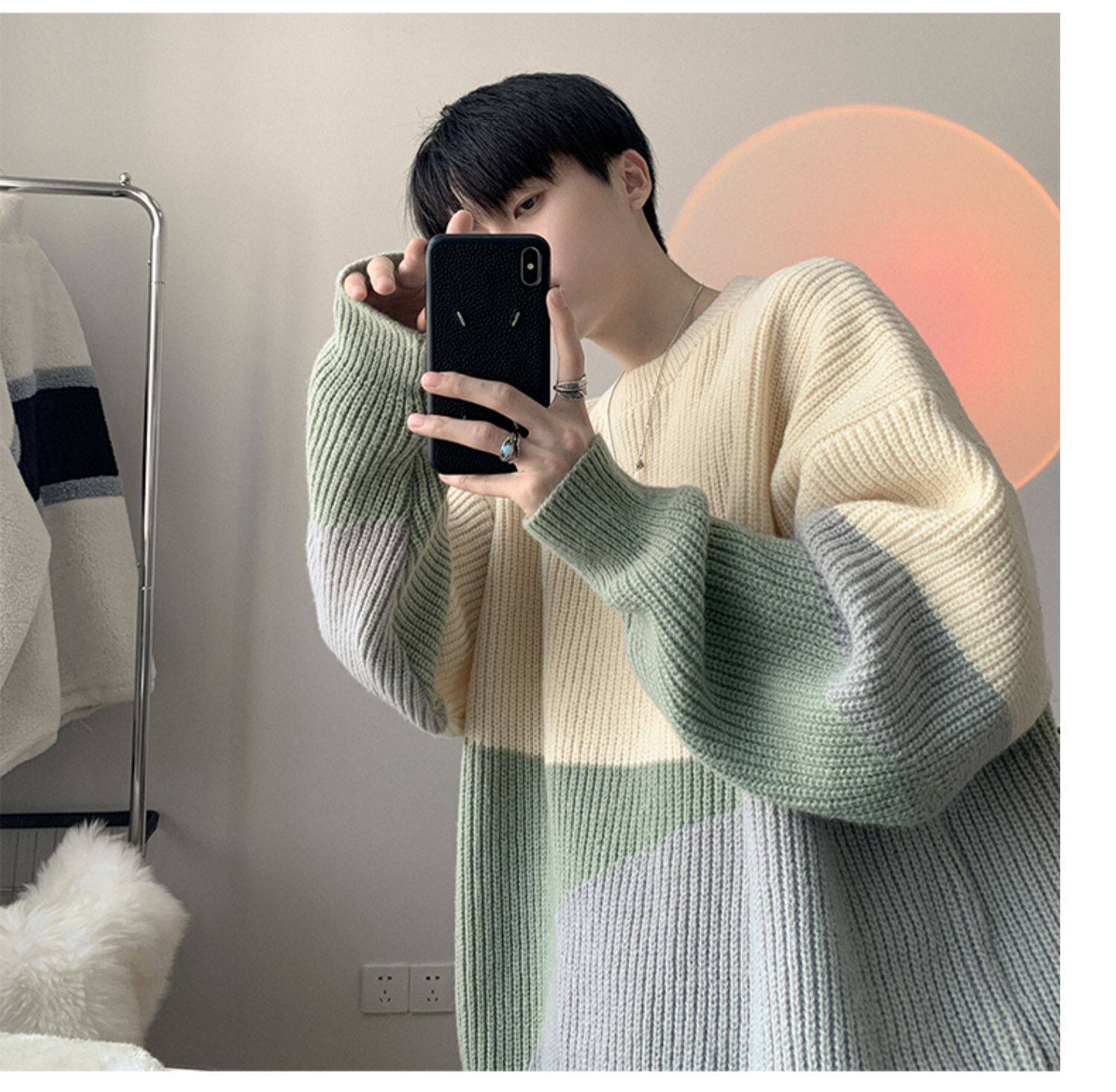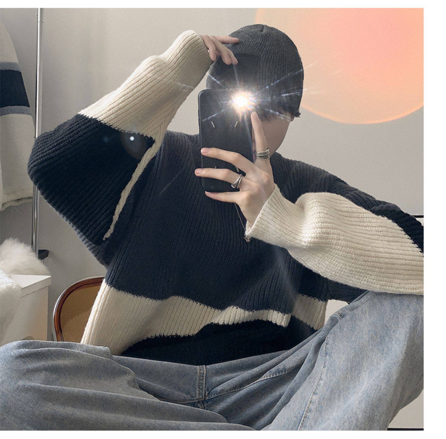 圆领毛衣男生秋冬季oversize时尚外穿休闲针织衫加厚拼接百搭毛衫