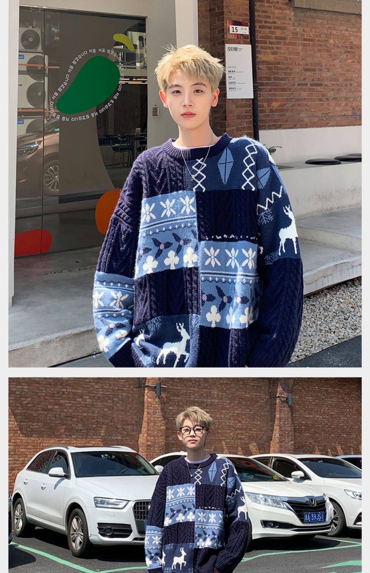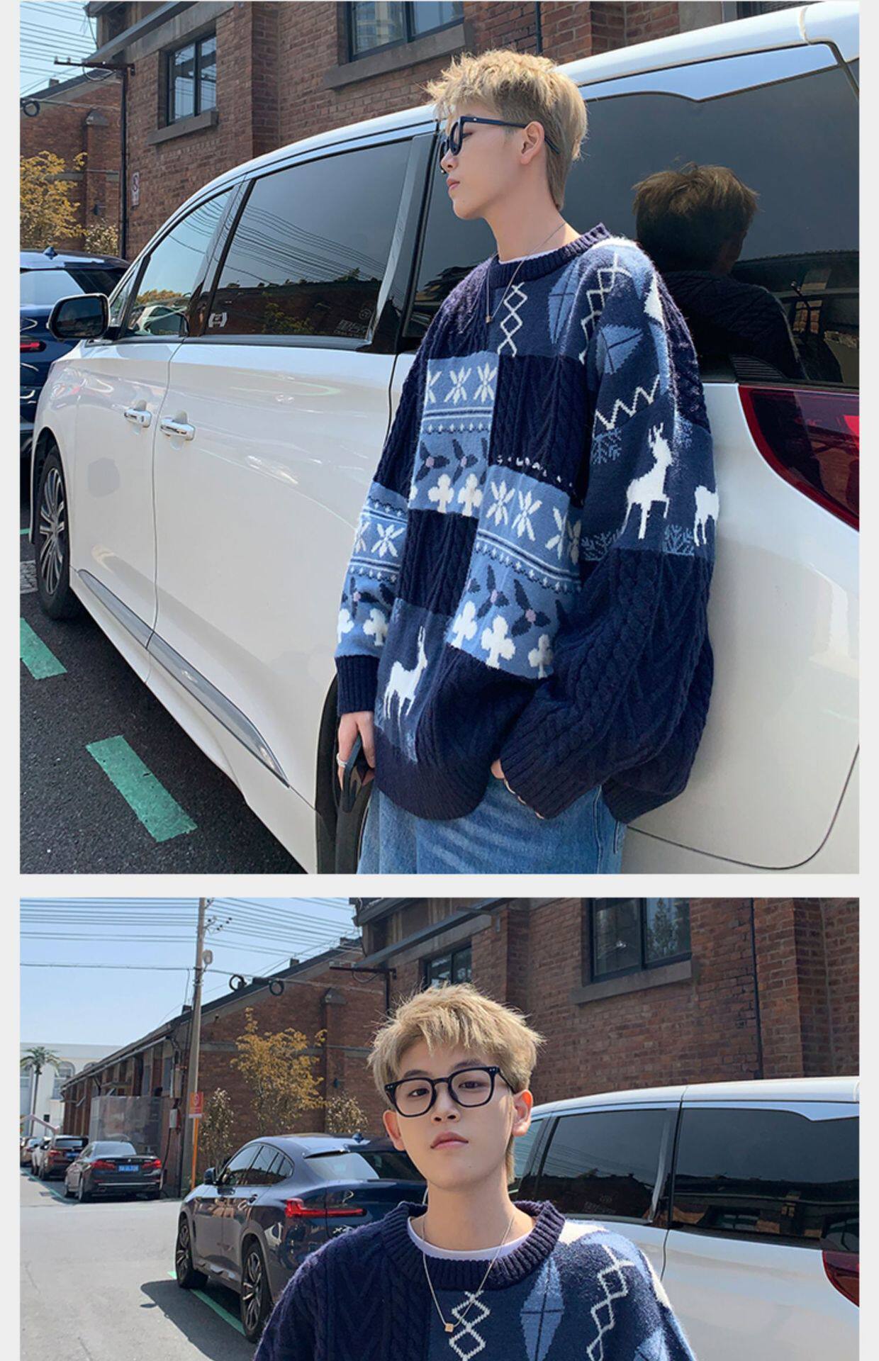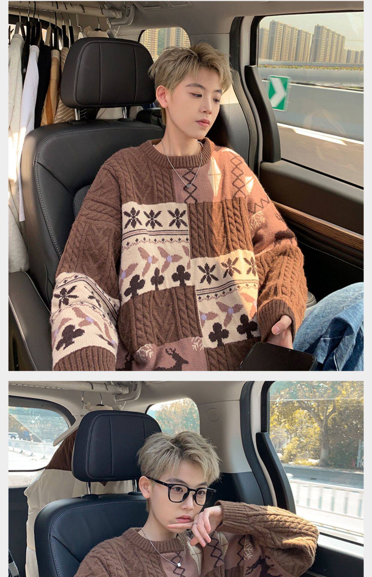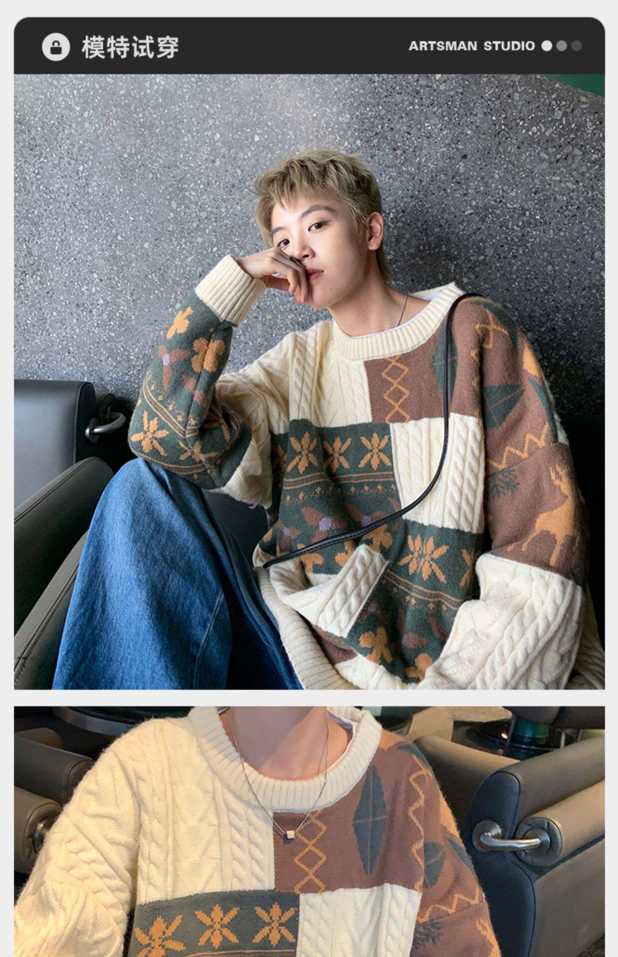 @港仔文艺男 拼接毛衣男冬季加厚潮牌复古秋冬款男生针织衫男款